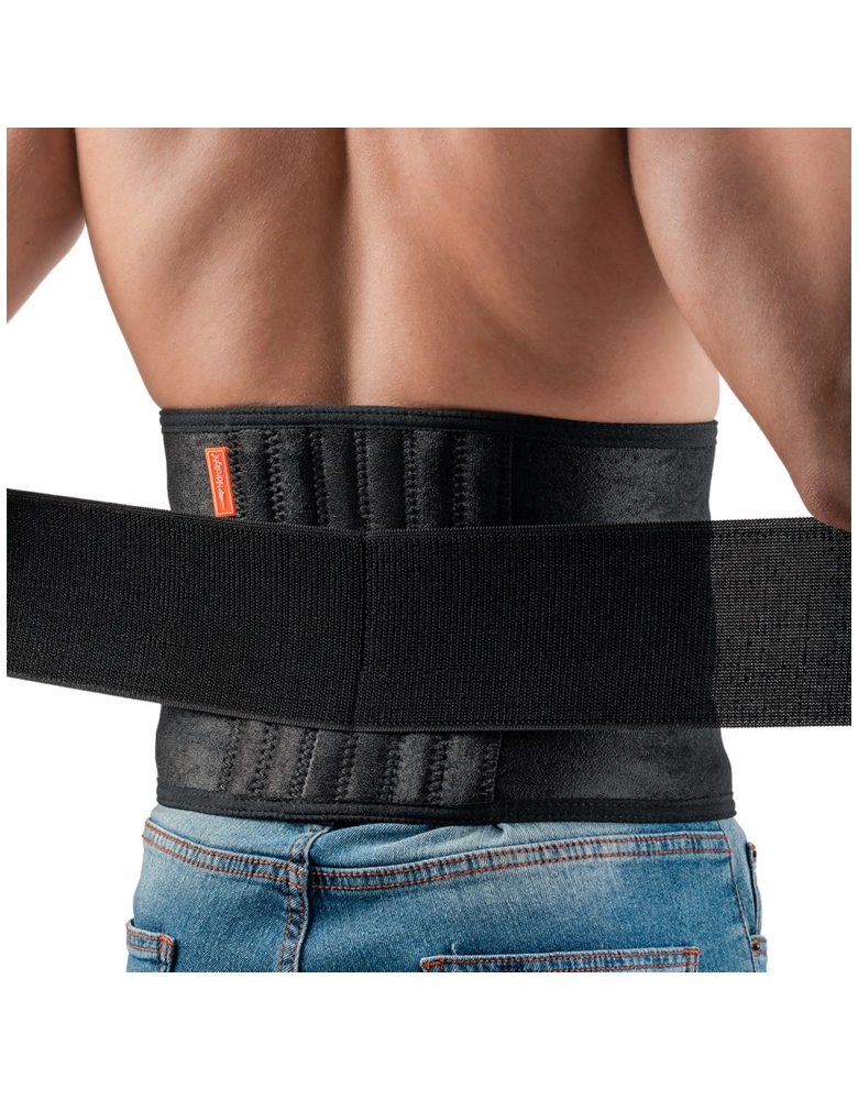 Posicione o produto na região lombar de forma que as abas fechem na frente do corpo, ajustando através das abas de fecho aderente. Aumente a compressão ajustando as faixas elásticas.