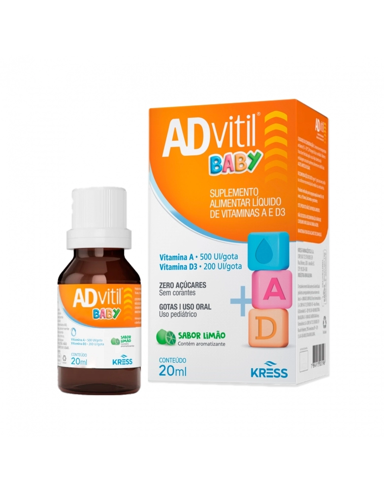 Advitil Baby da Kress é um suplemento indicado para suprir as deficiências das vitaminas A e D3. Auxilia no bom funcionamento do sistema imune, na formação de ossos e dentes, na absorção de cálcio e fósforo, no funcionamento muscular e na visão.