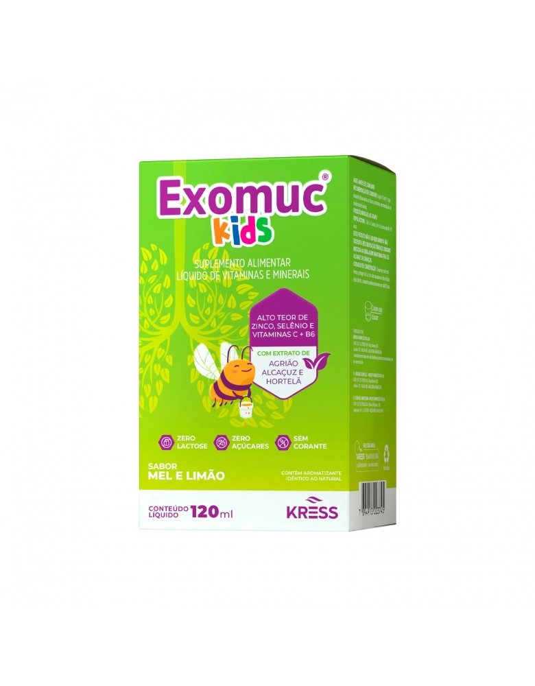 Exomuc Kids é um suplemento alimentar líquido que contém em sua fórmula a acetilcisteína, zinco, selênio e vitaminas C + B6, estas que são vitaminas e minerais essenciais para o corpo. Feito com extrato de agrião alcaçuz e hortelã, não contem em sua composição açúcares, glúten ou lactose.