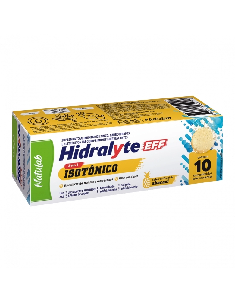 O Hidralyte EFF Natulab é um suplemento alimentar em comprimidos efervescentes, formulado com zinco, carboidratos e eletrólitos. Sua composição ajuda a repor minerais essenciais, contribuindo para a hidratação do organismo e auxiliando no equilíbrio eletrolítico, especialmente em situações de perda de líquidos e sais minerais.