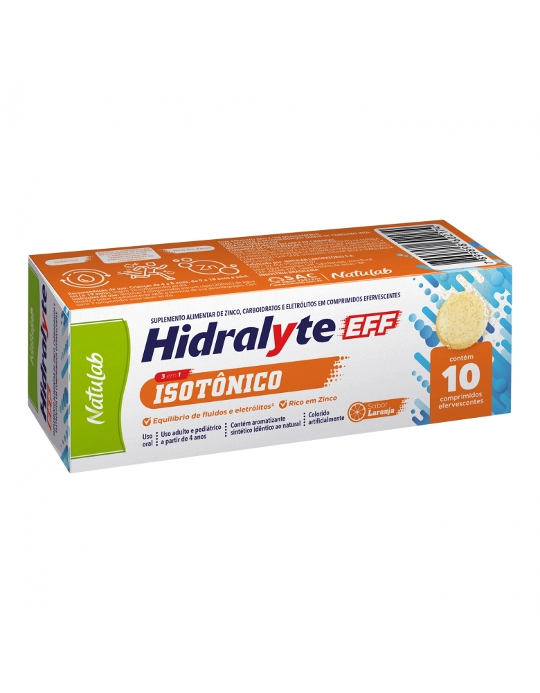 O Hidralyte EFF Natulab é um suplemento alimentar em comprimidos efervescentes, formulado com zinco, carboidratos e eletrólitos. Sua composição ajuda a repor minerais essenciais, contribuindo para a hidratação do organismo e auxiliando no equilíbrio eletrolítico, especialmente em situações de perda de líquidos e sais minerais.