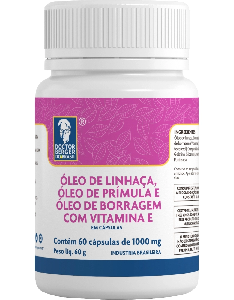O Óleo de linhaça, Prímula e Borragem da Doctor Berger é um suplemento com diversos benefícios por associar esses três tipos de óleos. O óleo de linhaça auxilia no sistema imune e é fonte de ácido alfa linolênico, lignina, ácido linoleico e vitamina E. O óleo de prímula alivia os sintomas da TPM (tensão pré-menstrual) e previne efeitos como dor no peito, eczema e retarda a diabetes. O óleo de borragem é extremamente conhecido por prevenir transtornos cardiovasculares. A partir disso, é um produto com enorme potencial de promoção de saúde feminina.