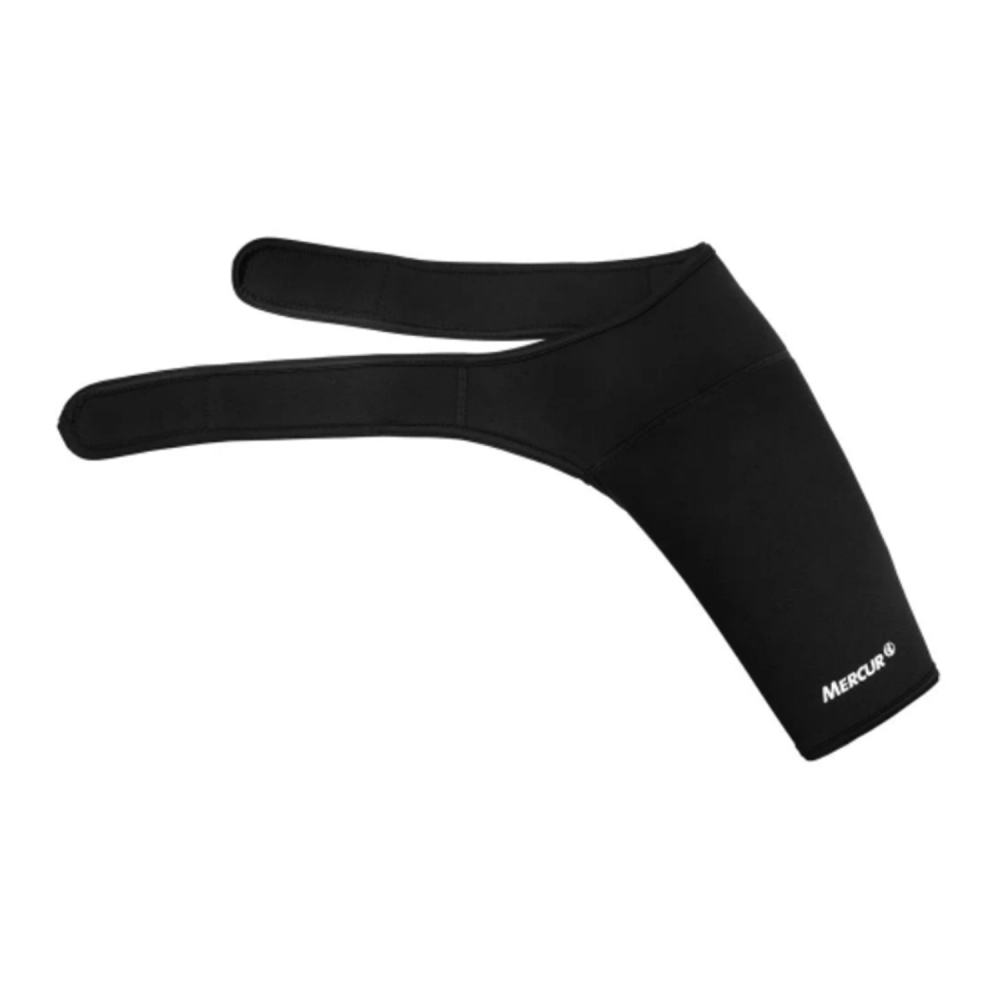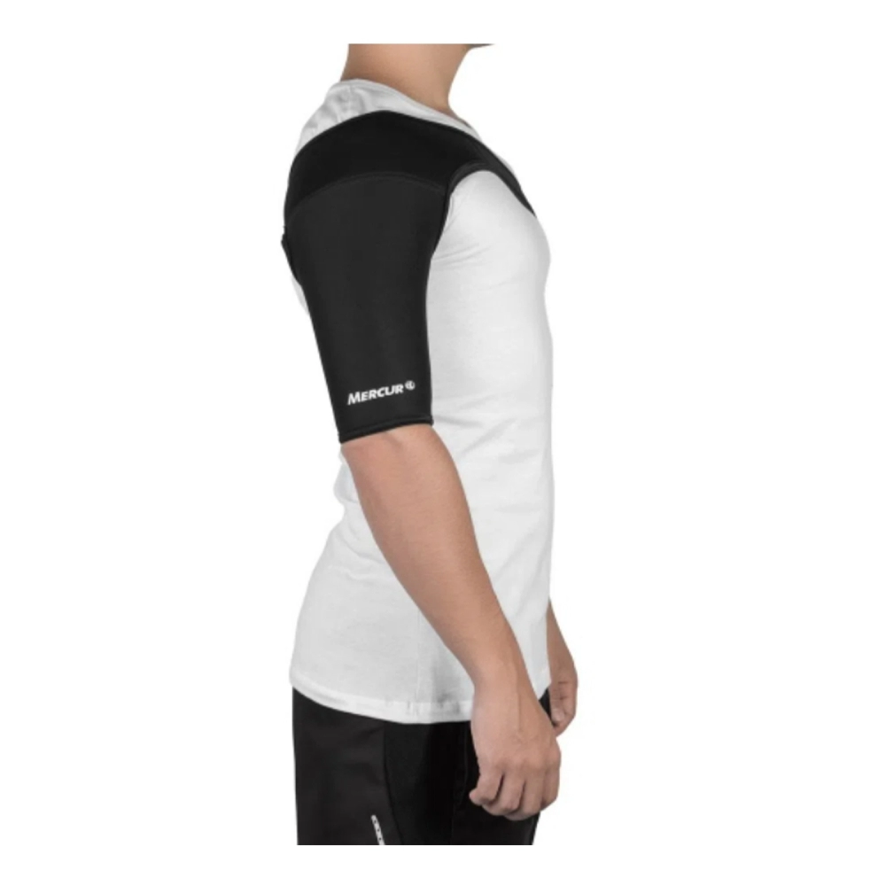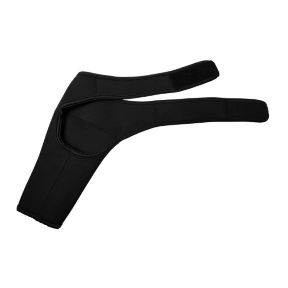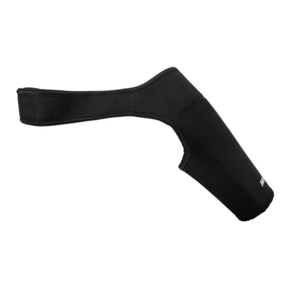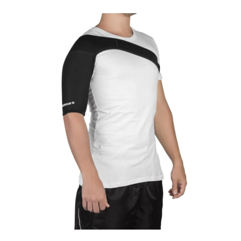 Pode ser utilizado no ombro direito ou esquerdo, é confeccionado em Neoprene®, que mantém a região aquecida, e é ajustável por fecho aderente.