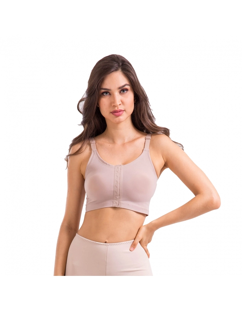 Um sutiã perfeito para você ficar confortável e não perder o estilo mesmo depois da cirurgia. Esta peça foi cuidadosamente desenvolvida com o tecido Lycra® Power de compressão que estimula a microcirculação sanguínea e o metabolismo celular, promovendo conforto e bem-estar no uso diário. Possui alças largas com regulagem, bojo moldado com abertura (frontal por colchetes de regulagem dupla) e laterais mais largas para melhor sustentação e ajuste no corpo. As costuras são externas para que não haja contato com a área lesionada, proporcionando muito mais conforto e segurança no pós-operatório.