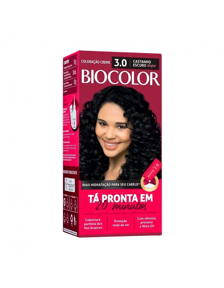 A nova Tintura de Cabelo Biocolor Castanho Escuro Chique 3.0 oferece uma cobertura perfeita dos fios brancos, cor intensa e durabilidade. A coloração é de fácil aplicação e age em apenas 20 minutos. Além disso, o kit promove um banho de hidratação no cabelo com o novo condicionador Hidratação Power que protege e entrega maciez aos fios. Sua composição conta com amônia e um novo aroma floral.