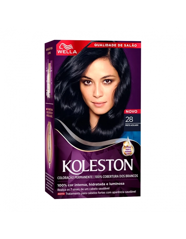 Desenvolvida para quem procura uma coloração permanente e de cor intensa e duradora, a Coloração Creme Koleston Preto Azulado 28, da Wella, oferece 100% da cobertura dos fios brancos, graças a tecnologia resistente à água. Seu exclusivo Tratamento Gloss Intenso deixa o cabelo com mais brilho, maciez e ajuda a manter a intensidade da cor.