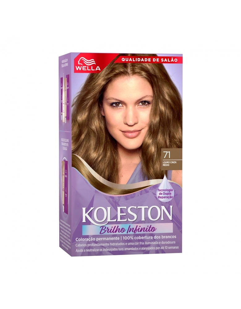 Desenvolvida para quem procura uma coloração permanente e de cor intensa e duradora, a Coloração Creme Koleston Louro Cinza Médio 71, da Wella, oferece 100% da cobertura dos fios brancos, graças a tecnologia resistente à água. Seu exclusivo Tratamento Gloss Intenso deixa o cabelo com mais brilho, maciez e ajuda a manter a intensidade da cor.