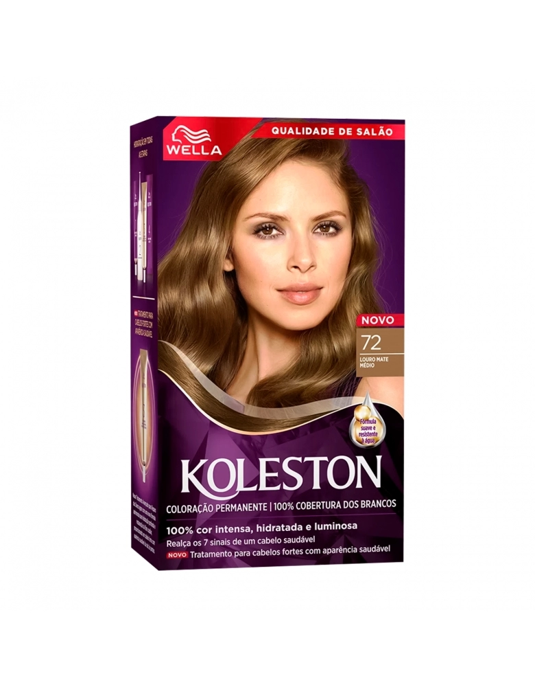 Desenvolvida para quem procura uma coloração permanente e de cor intensa e duradora, a Coloração Creme Koleston Louro Mate Médio 72, da Wella, oferece 100% da cobertura dos fios brancos, graças a tecnologia resistente à água. Seu exclusivo Tratamento Gloss Intenso deixa o cabelo com mais brilho, maciez e ajuda a manter a intensidade da cor.