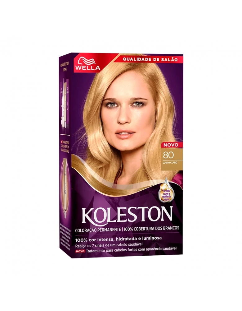 Desenvolvida para quem procura uma coloração permanente e de cor intensa e duradora, a Coloração Creme Koleston Louro Claro 80, da Wella, oferece 100% da cobertura dos fios brancos, graças a tecnologia resistente à água. Seu exclusivo Tratamento Gloss Intenso deixa o cabelo com mais brilho, maciez e ajuda a manter a intensidade da cor.