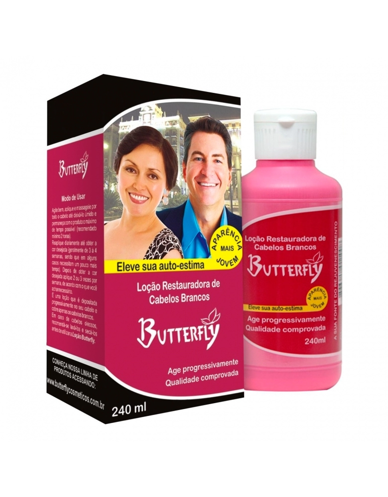 A Loção Restauradora de Cabelos Brancos Butterfly devolve gradativamente a cor natural dos fios brancos, seja ele loiro, castanho ou preto.Seu uso é recomendado para quem quer se ver livre de tinturas. Após seus cabelos retornarem a cor natural,geralmente de 30 a 40 dias, recomenda-se a utilização deste produto para manutenção dos fios brancos que forem nascendo.