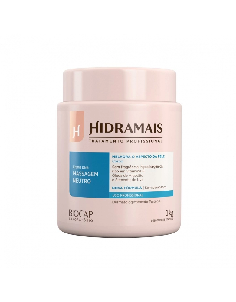 Creme para Massagem Hipoalergênico Neutro Hidramais 1kg Contém em sua fórmula uma combinação equilibrada de óleos vegetais, silicone e emolientes que proporcionam lubrificações perfeita para os movimentos de massagem. Não possui fragrância, assegurando um tratamento hipoalergênico especialmente indicado para as peles mais delicidas e sensíveis. Este produto foi formulado de maneira a minimizar possível surgimento de alergia. Ativos: Óleo de Algodão: Antioxidante natural, rico em tocoferol e vitamina E.
