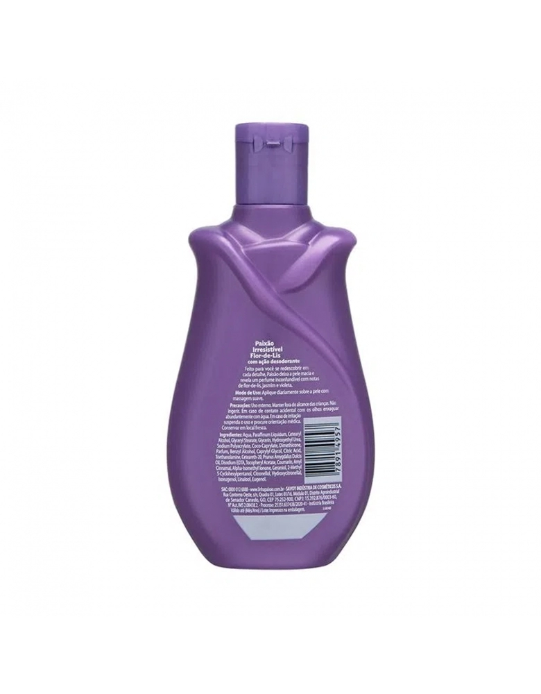 A Loção Hidratante Paixão Irresistível possui uma fórmula inovadora que hidrata e protege contra transpiração excessiva da pele. Seu uso é indicado para inibir o ressecamento da pele de uma forma saudável deixando macia e sedosa em poucas vezes de uso. Garante uma hidratação profunda sem causar agressões na pele. A Loção Hidratante Paixão Irresistível auxilia na manutenção da pele deixando totalmente radiante e irresistível do jeito que todo mulher realmente merece.