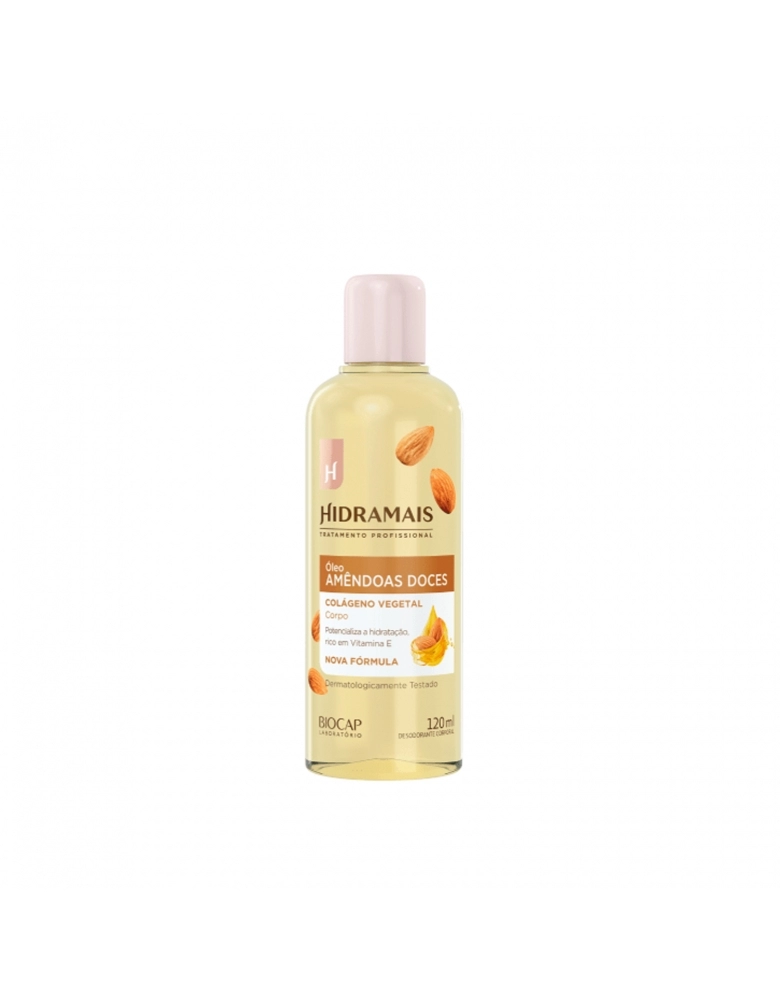 O Óleo Corporal Amêndoas Doces & Colágeno Hidramais é de ação nutritiva, garantindo elasticidade e melhora na absorção de nutrientes. Produto sem testes em animais.