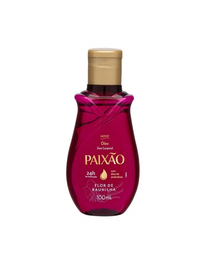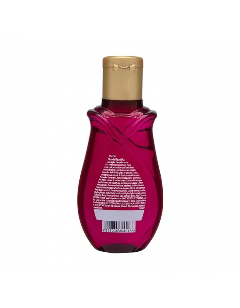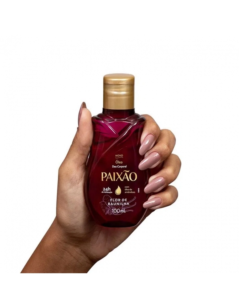 O Óleo Corporal Paixão com ação desodorante possui óleo de amêndoas que vai garantir hidratação por até 24horas. Sua aplicação deve ser feita logo após o banho, com a pele ainda molhada e se desejar, pode enxaguar levemente ou não. De uso diário, é recomendado para todos os tipos de pele. Sua fragrância traz a suculência das frutas vermelhas, combinadas com um buquê floral feminino e um fundo cremoso e sensual de Baunilha e açúcar caramelizado.