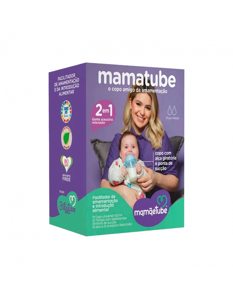 O Mamatube é um copo facilitador de amamentação e introdução alimentar que oferta leite materno na ausência da mãe (sucos e suplementos também). Ele tem uma ponta de sucção adequada para proteger a amamentação e vem com alças giratórias para o bebê segurar.