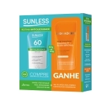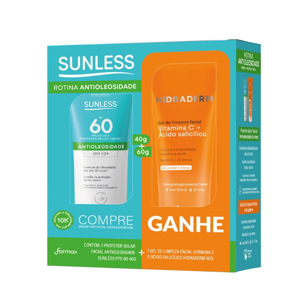 O Kit Sunless Antioleosidade Protetor Solar Facial FPS60 40g + Gel de Limpeza Vitamina C 60g foi desenvolvido para oferecer uma rotina completa de cuidados com a pele. O protetor solar facial promove proteção UVA + UVB FPS60, ajuda a controlar a oleosidade e previne manchas solares, enquanto o gel de limpeza enriquecido com Vitamina C remove impurezas e promove sensação de frescor e revitalização.