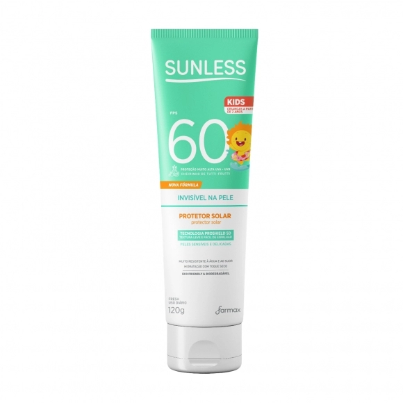 O Protetor Solar Kids FPS 60 Sunless é especialmente formulado para proteger a pele delicada das crianças contra os raios UVA e UVB, oferecendo proteção solar muito alta. De textura leve e toque seco, ele não deixa sensação pegajosa, garantindo conforto mesmo em atividades externas intensas. Sua fórmula é resistente à água e ao suor, possui fragrância suave de tutti-frutti e é livre de parabenos, além de ser dermatologicamente testada.