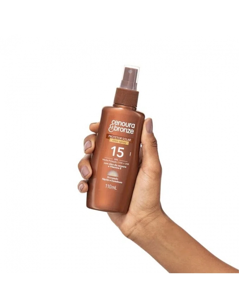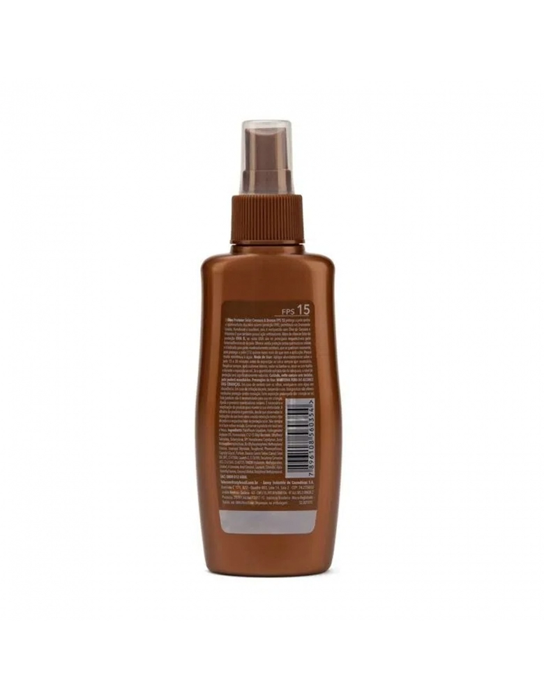 O Protetor Solar Óleo Spray Cenoura e Bronze 15 FPS minimiza os danos mais profundos na pele causados pelos raios infravermelhos. Protege também contra a vermelhidão, ardência e rugas causadas pela exposição solar. Além disso, o Protetor Solar Óleo Spray Cenoura e Bronze 15 FPS permite um bronzeado bonito, duradouro e saudável, pois é enriquecido com Óleo de Cenoura e Vitamina E, contribuindo de forma benéfica para a saúde da sua pele.