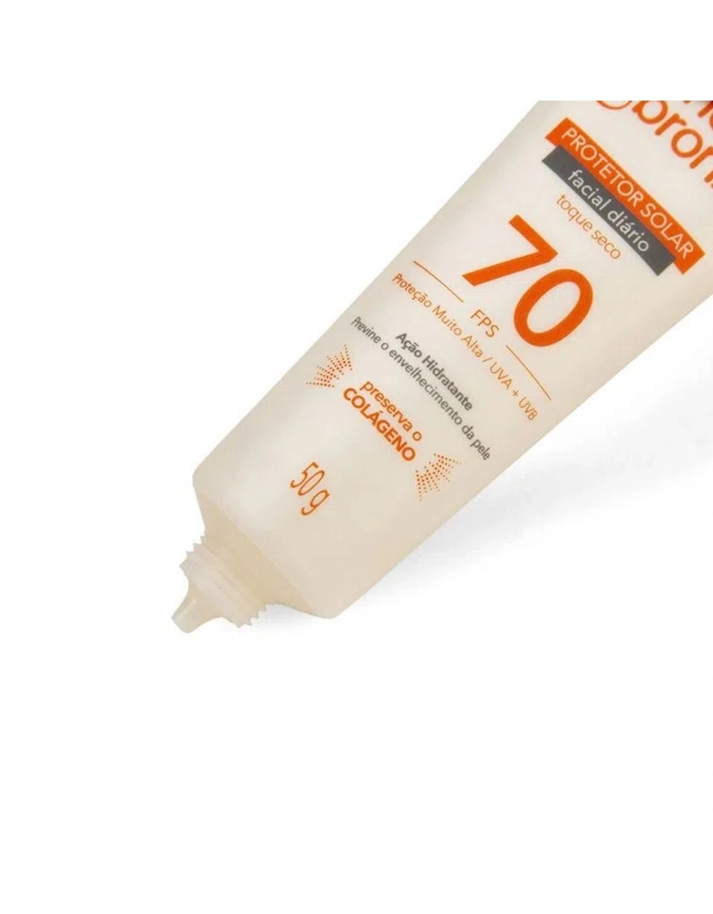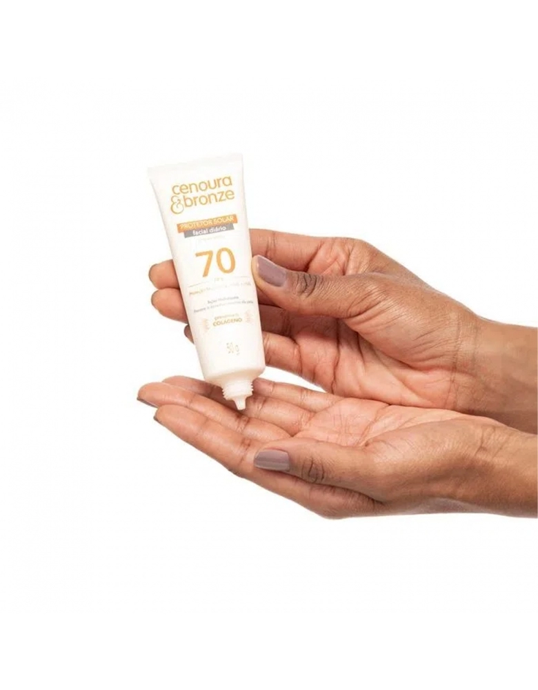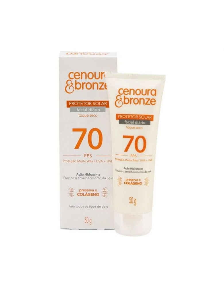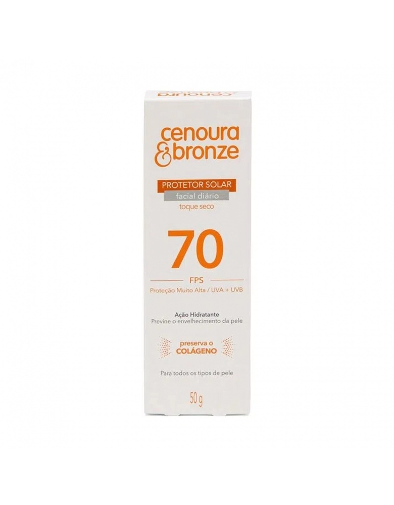Protetor Solar Facial Diário Cenoura & Bronze FPS 70 50g O Protetor Solar Facial Diário de Cenoura & Bronze protege a sua pele contra a ação danosa causada pela radiação solar UVA e UVB. Indicado para todos os tipos de pele, o produto tem toque seco, ação hidratante, textura suave e rápida absorção. Possui bico dosador para uma aplicação mais delicada. Os produtos de proteção solar de Cenoura & Bronze possuem a tecnologia inovadora Preserva o Colágeno, que minimiza os danos mais profundos na pele causados pelos raios infravermelhos, devido à ação antioxidante do produto, mesmo quando não estamos diretamente expostos ao sol. Protege contra a vermelhidão, ardência e rugas causadas pela exposição solar. Previne o envelhecimento precoce e a perda de firmeza e elasticidade, preservando o colágeno da pele.