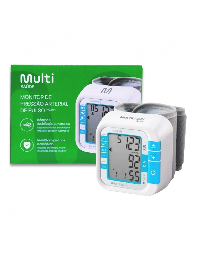 O novo aparelho de pressão digital automático de pulso Multi é uma solução completa para medição da pressão arterial. Além das medições tradicionais de pressão arterial e frequência cardíaca, possui uma série de outros benefícios, como: indicador de arritmia cardíaca e indicador gráfico de nível de hipertensão. Seu Design é moderno, fácil de utilizar e extremamente compacto, facilitando o transporte. Todas essas funções permitem um acompanhamento completo dos níveis de pressão arterial, sempre contando com a qualidade e segurança da marca Multi, que oferece uma garantia de 6 anos, assegurando tranquilidade por um período estendido Procure sempre um médico especializado, nunca faça automedicação.