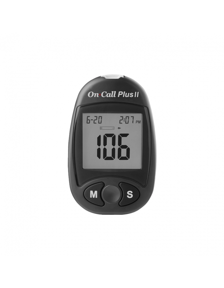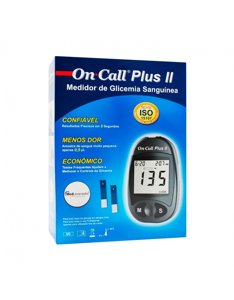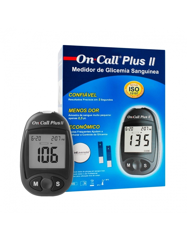 O medidor de glicemia On Call Plus II é indicado para o uso profissional e pessoal. Prático, simples e seguro, apresenta visor amplo, o que facilita a leitura do usuário, além de garantir conforto, já que precisa de apenas 0,5 µL (microlitro) de sangue para realizar o teste. Após cinco segundos, o resultado fica disponível. Possui memória para gravar até 300 respostas com data e hora.