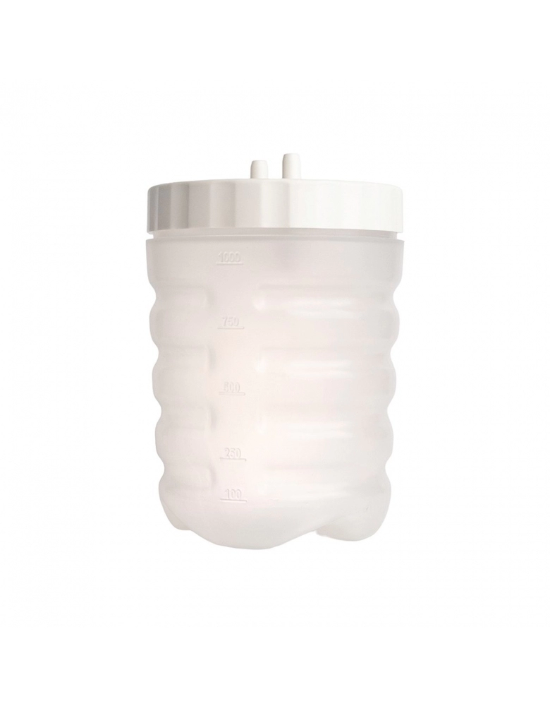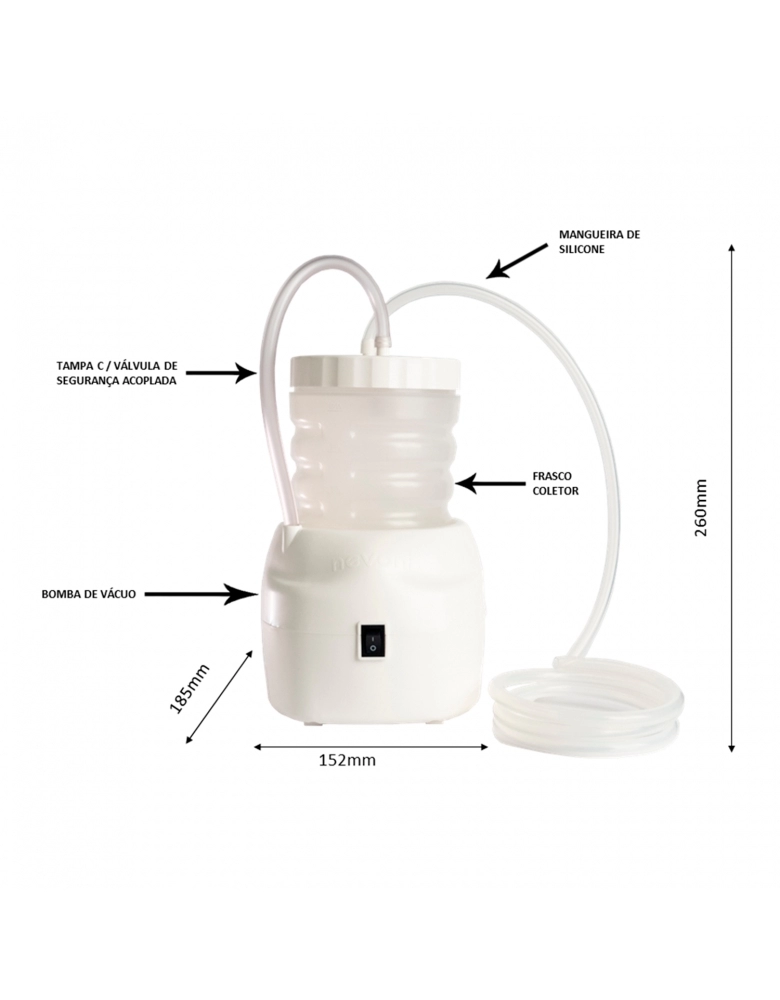 Acompanha frasco coletor com capacidade para 1 litro, e tampa para vedação, que por ser composta por uma válvula de segurança, evita o transbordamento interrompendo o vácuo quando o frasco está cheio. Por seu sistema de armazenamento ser completamente fechado, não causa mau odores no ambiente.