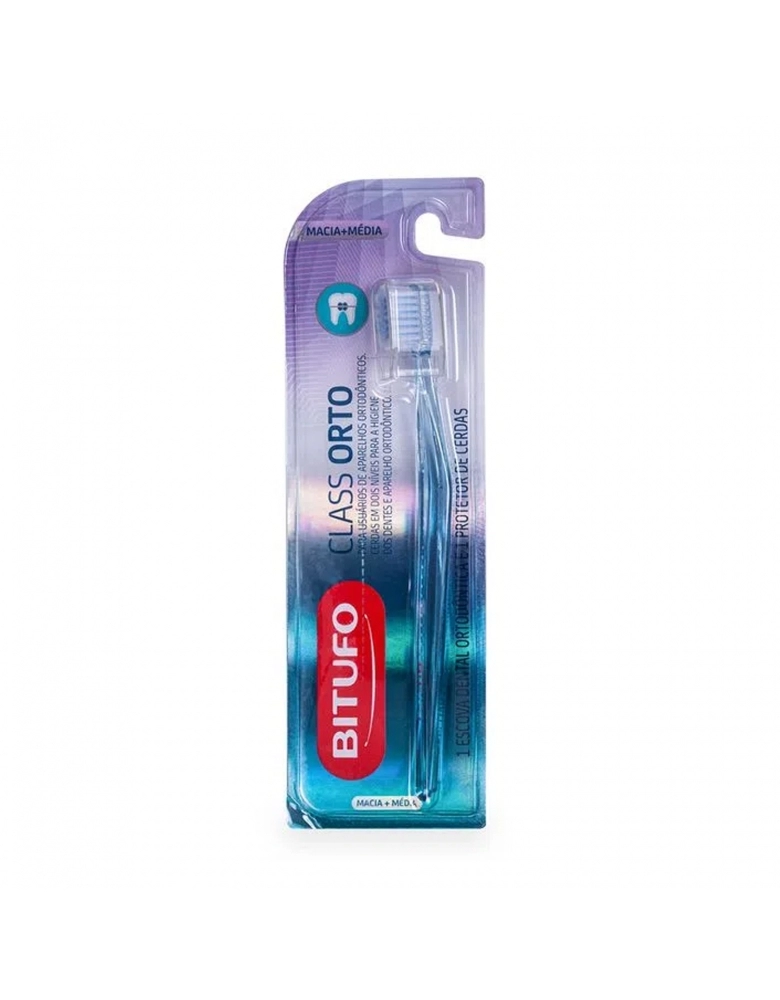 Escova de Dente Bitufo Class Orto foi desenvolvida para quem usa aparelhos ortodônticos. Ela possui cerdas com perfil anatômico em dois níveis: cerdas macias nas laterais para os dentes e gengivas e cerdas médias centrais para os braquetes. Limpeza completa. A cabeça é compacta e ligeiramente inclinada para escovação no ângulo correto. Esse produto contém 1 protetor de cerdas. Atenção: esse produto possui as cores sortidas e a escolha é feita aleatoriamente no momento do envio do pedido. Disponível em rosa, roxo, azul e cinza, com protetor transparente.