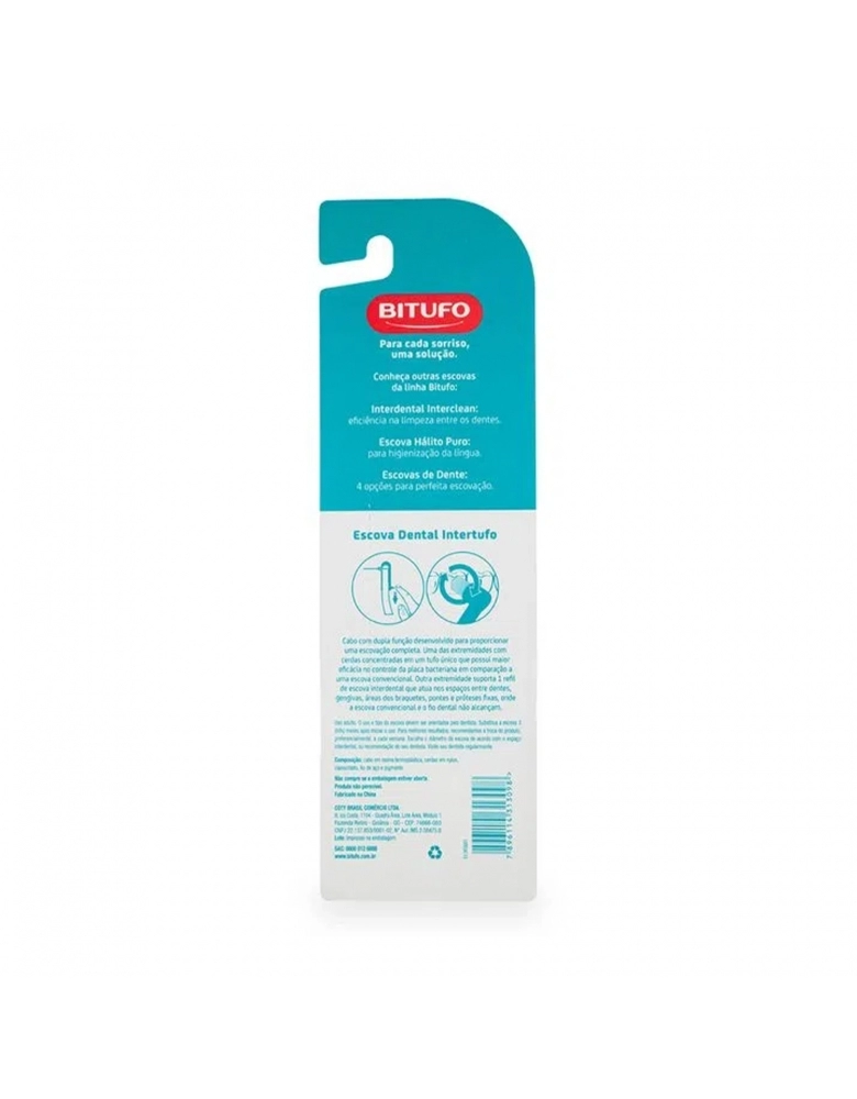 Escova de Dente Bitufo Intertufo possui cabo com dupla função para escovação completa. Enquanto o tufo único, de cerdas extramaciais, promove maior eficácia no controle da placa bacteriana, a escova interdental garante limpeza entre os dentes. O produto contém 6 refis interdentais. Atenção: esse produto possui as cores sortidas e a escolha é feita aleatoriamente no momento do envio do pedido. Disponível: azul, rosa, cinza e roxo.