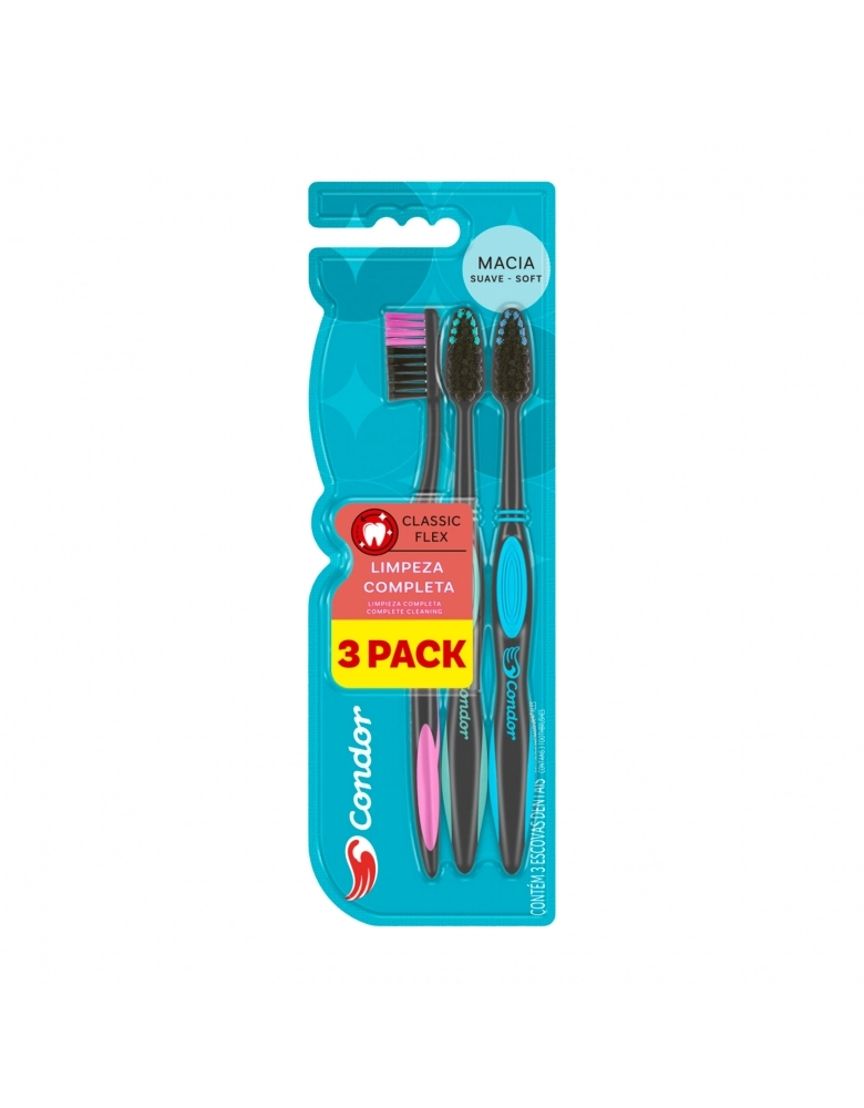 A Condor Higiene Bucal é a sua escolha ideal por todas as suas possibilidades. Pensando nisso, lançamos a escova dental Classic Flex. Um novo conceito em escova dental, moderna e super econômica. Disponível com cerdas médias, corte reto, cabo emborrachado e com limpador de língua, o que proporciona conforto e eficiência para a saúde bucal.