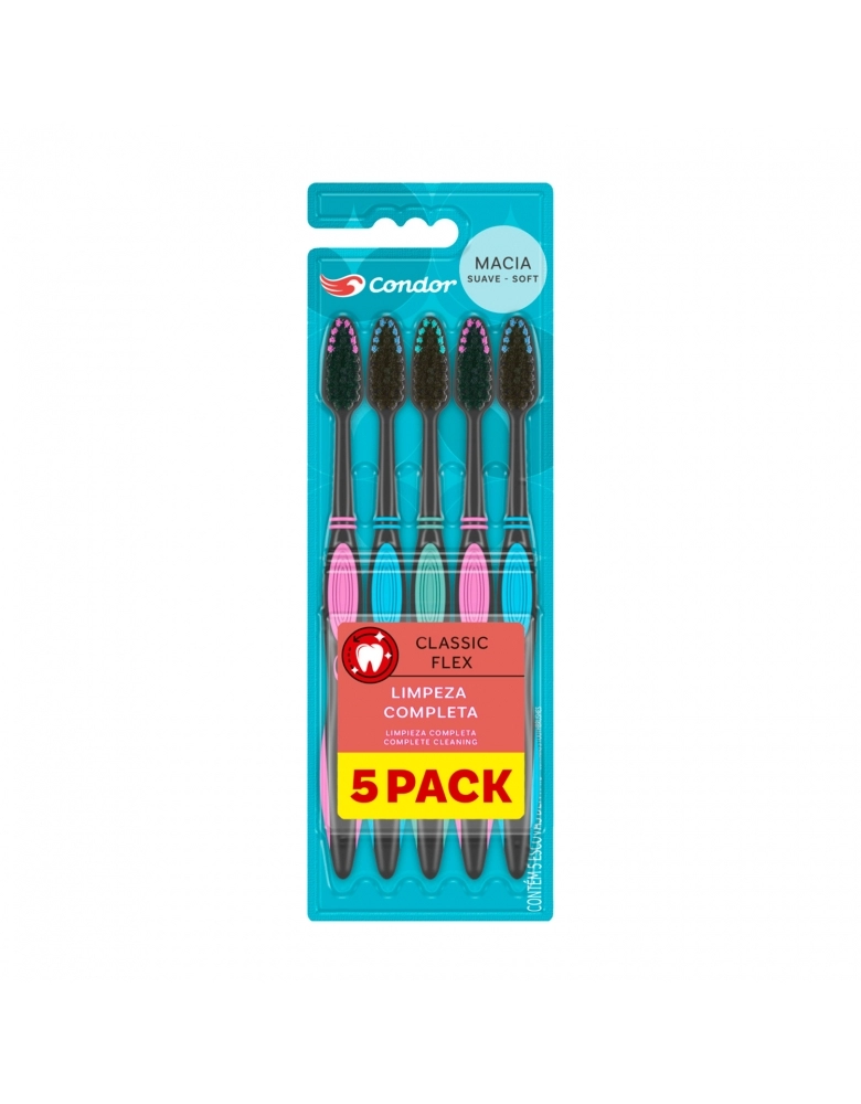 A Condor Higiene Bucal é a sua escolha ideal por todas as suas possibilidades. Pensando nisso, lançamos a escova dental Classic Flex. Um novo conceito em escova dental, moderna e super econômica. Disponível com cerdas médias, corte reto, cabo emborrachado e com limpador de língua, o que proporciona conforto e eficiência para a saúde bucal.