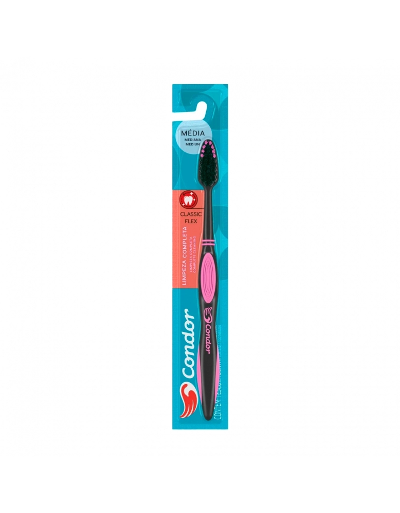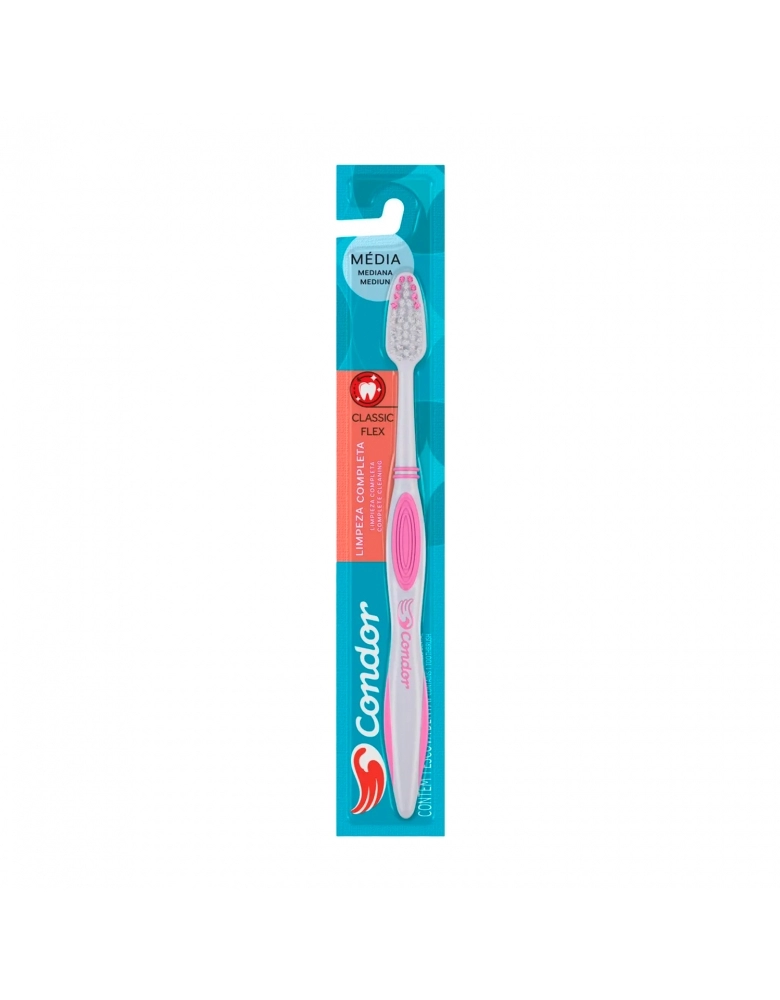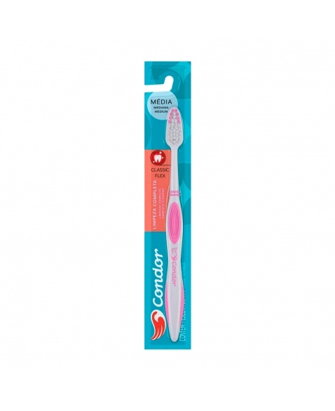A Condor Higiene Bucal é a sua escolha ideal por todas as suas possibilidades. Pensando nisso, lançamos a escova dental Classic Flex. Um novo conceito em escova dental, moderna e super econômica. Disponível com cerdas médias, corte reto, cabo emborrachado e com limpador de língua, o que proporciona conforto e eficiência para a saúde bucal.