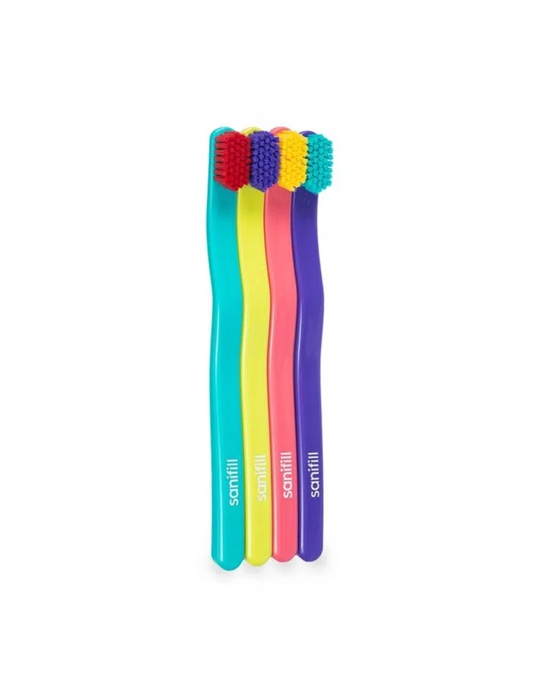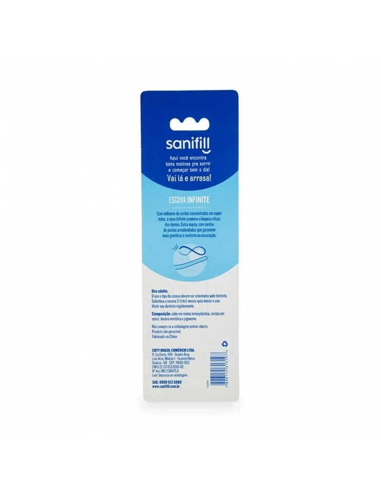 Escova de Dente Sanifill Infinite possui milhares de cerdas extramacias concentradas em super tufos com pontas arredondadas, que promovem a limpeza eficaz dos dentes com mais gentileza e conforto, durante a escovação. Atenção: esse produto possui as cores sortidas e a escolha é feita aleatoriamente no momento do envio do pedido. Disponível em rosa, amarelo e azul; amarelo, azul e roxo e rosa, roxo e amarelo.