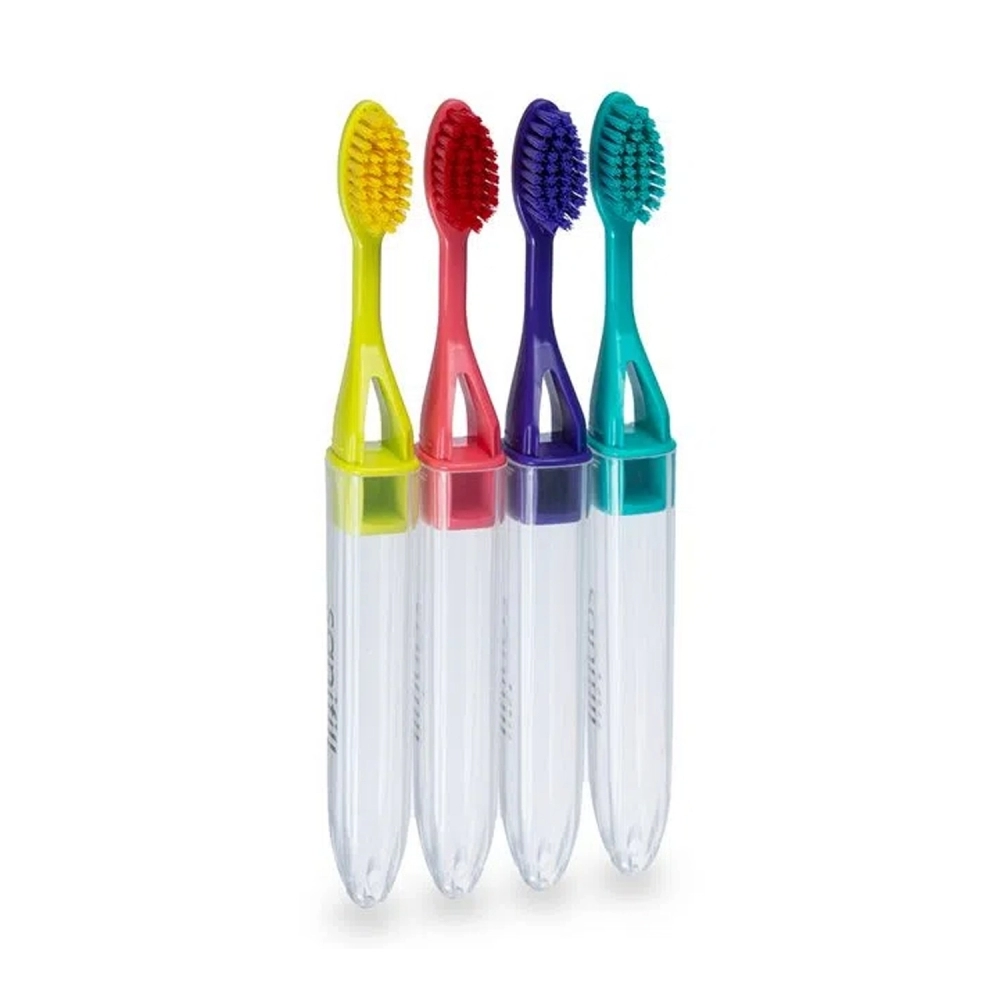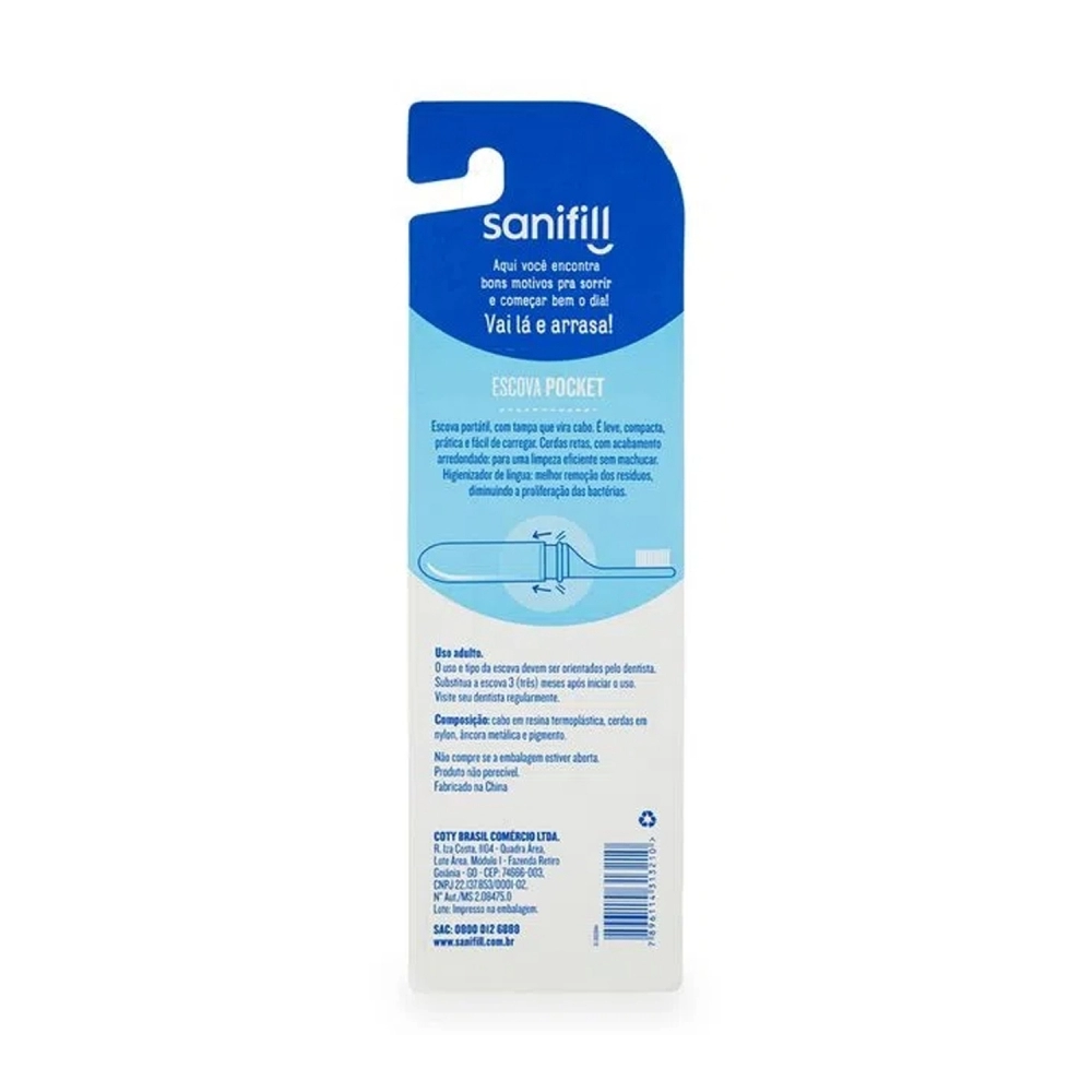 A Escova de Dente Sanifill Pocket é ideal para ter sempre à mão em viagens ou compromissos. Com tampa que vira cabo, é portátil, leve e compacta, cabe facilmente em necessaires e bolsas. Suas cerdas macias possuem acabamento arredondado para uma limpeza eficiente sem machucar, enquanto o higienizador de língua auxilia na remoção dos resíduos diminuindo a proliferação das bactérias. Uso adulto. Atenção: esse produto possui cores sortidas e a escolha é feita aleatoriamente no momento do envio do pedido. Disponível em verde, amarelo, roxo e vermelho.