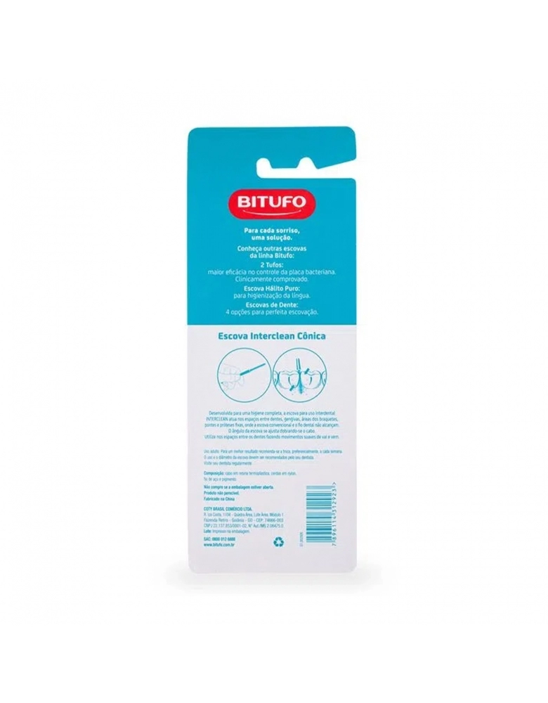 Escova Interdental Bitufo Interclean é eficiente na limpeza entre os dentes, espaços entre braquetes, pontes e próteses fixas, onde a escova convencional não chega. O ângulo da escova se ajusta dobrando-se o cabo e com movimentos suaves de vai e vem, irá auxiliar a redução da placa bacteriana e previne problemas nas gengivas. Escovação completa.
