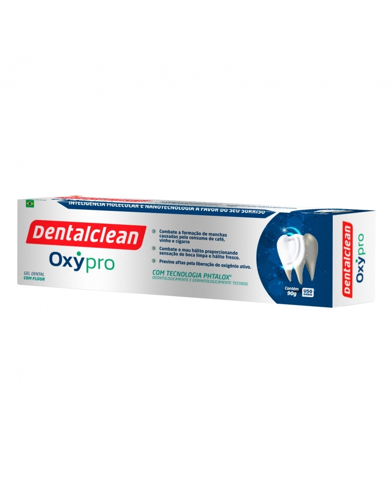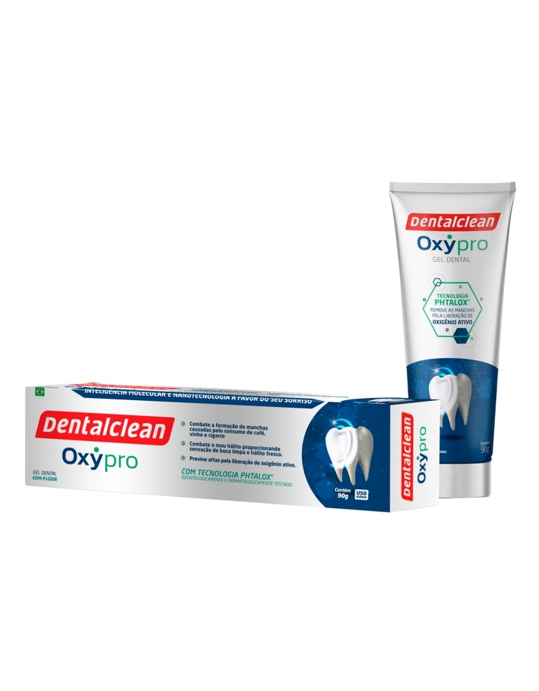 Conheça o novo creme dental clareador em gel da Dentalclean, o Oxypro. Com sua exclusiva tecnologia Phtalox®, ele é capaz de reduzir manchas dos dentes, acelerar a cicatrização e a prevenção de aftas, além de reduzir 99,9% dos microrganismos da boca. A Dentalclean, utilizando de inteligência e nanotecnologia a favor do seu sorriso, criou a fórmula em Gel dental contendo tecnologia Phtalox® que ativa o Oxigênio molecular presente na boca.