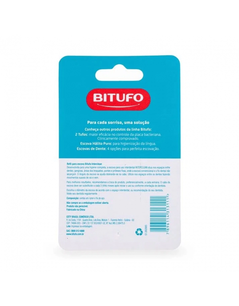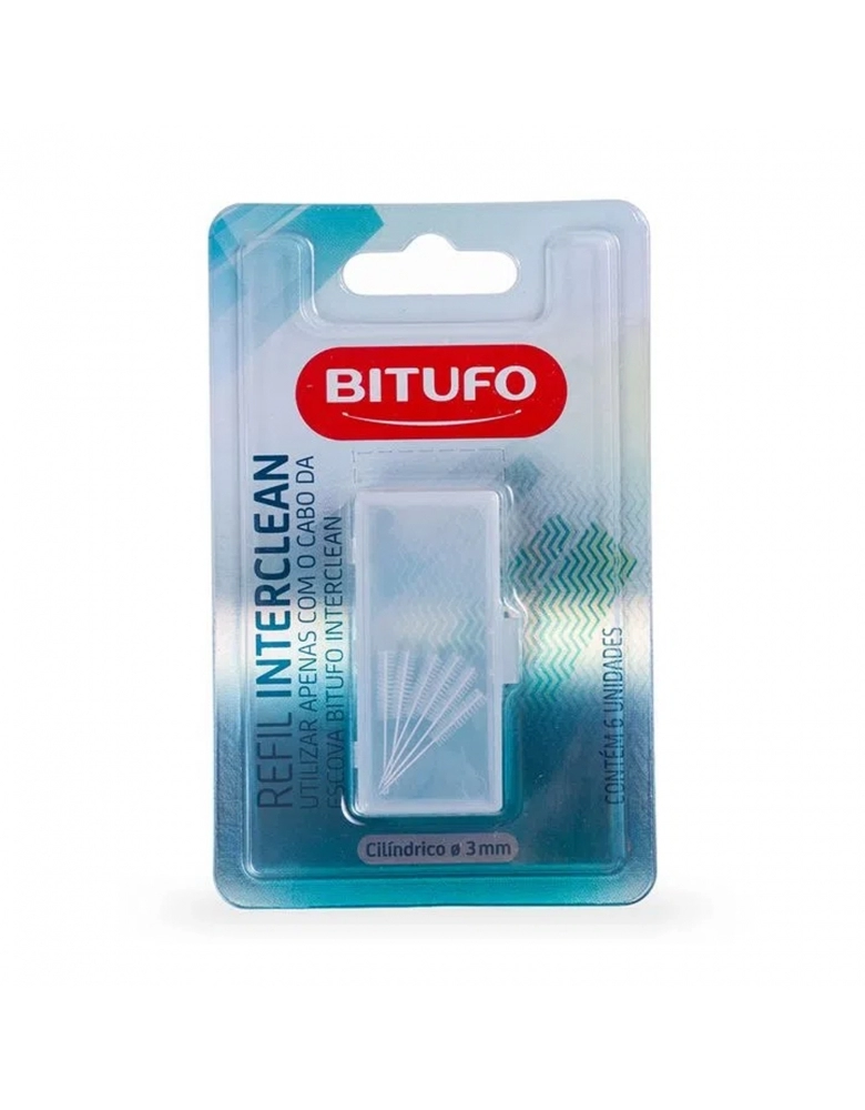 O refil de Escova de Dente Bitufo Interclean tem tamanho cilíndrico 3 milímetros e contém 6 unidades. Escova de Dente Bitufo Interclean é eficiente na limpeza entre os dentes, auxilia na redução da placa bacteriana e previne problemas nas gengivas, alcançando os espaços entre os braquetes, pontes e próteses fixas, onde a escova convencional não alcança.