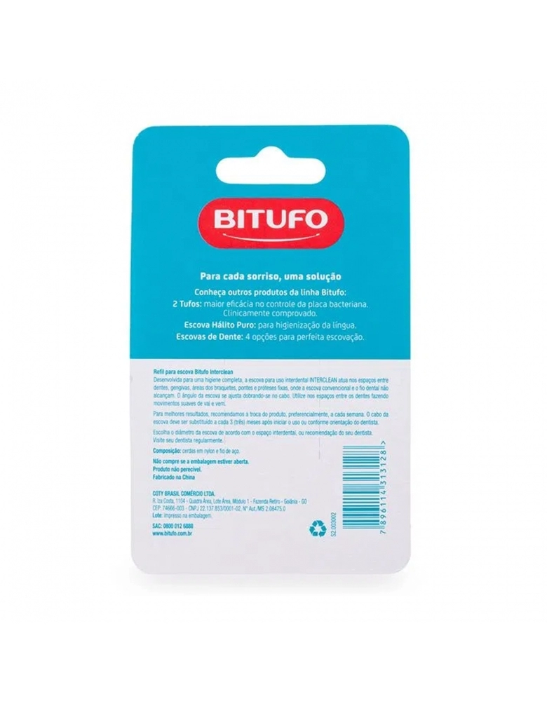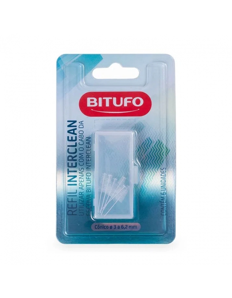 O refil de Escova de Dente Bitufo Interclean tem tamanho cônico 3 a 6,2 milímetros e contém 6 unidades. Escova de Dente Bitufo Interclean é eficiente na limpeza entre os dentes, auxilia na redução da placa bacteriana e previne problemas nas gengivas, alcançando os espaços entre os braquetes, pontes e próteses fixas, onde a escova convencional não alcança.