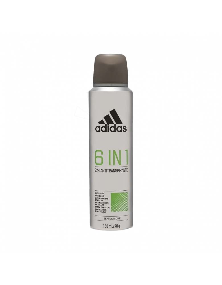 O novo desodorante aerossol antitranspirante masculino Adidas 6 In 1 protege por 72 horas e possui fragrância exclusiva. O desodorante Adidas 6 In 1 é dermatologicamente testado, respeita o PH da pele e possui fórmula vegana e sem silicone.