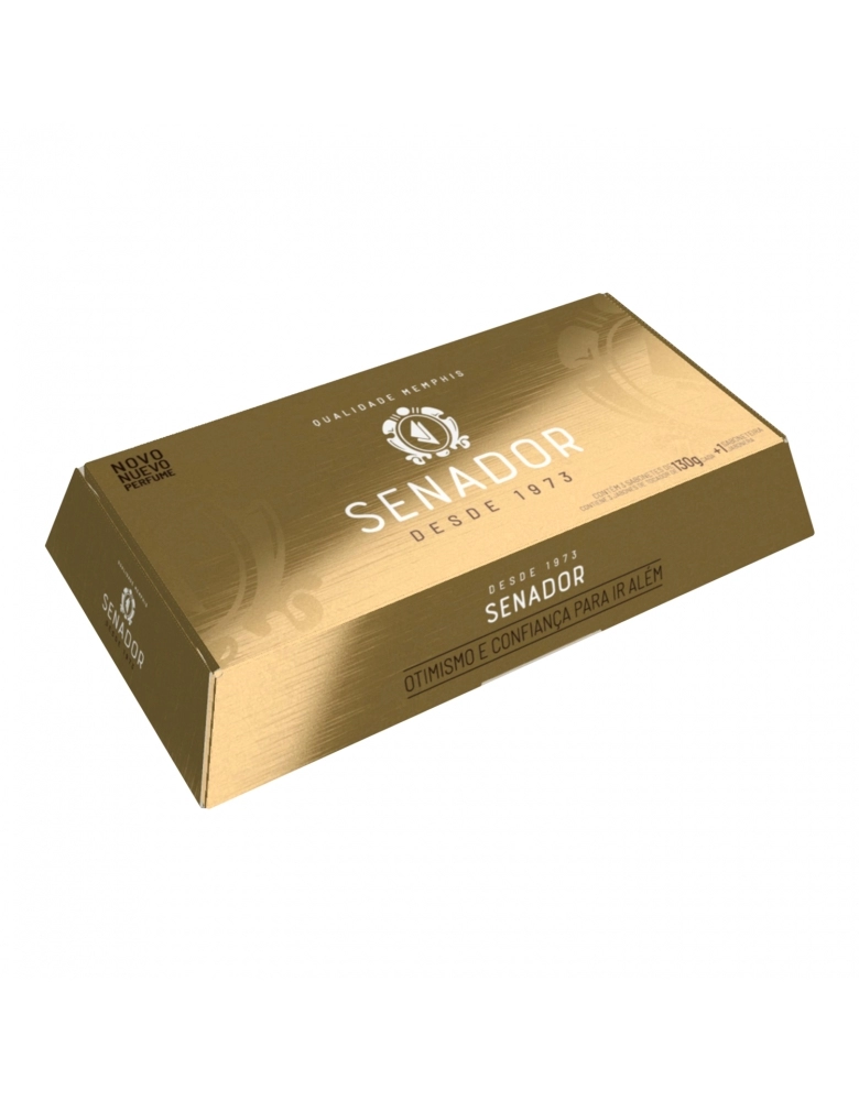 Estojo premium Senador Gold com Saboneteira 390g, ideal para presente. Comemora 50 anos da marca e oferece três Sabonetes Senador Gold 130g com fragrância envolvente e hidratante. Destaca-se pelas notas solares da alta perfumaria. Sofisticação em um presente.