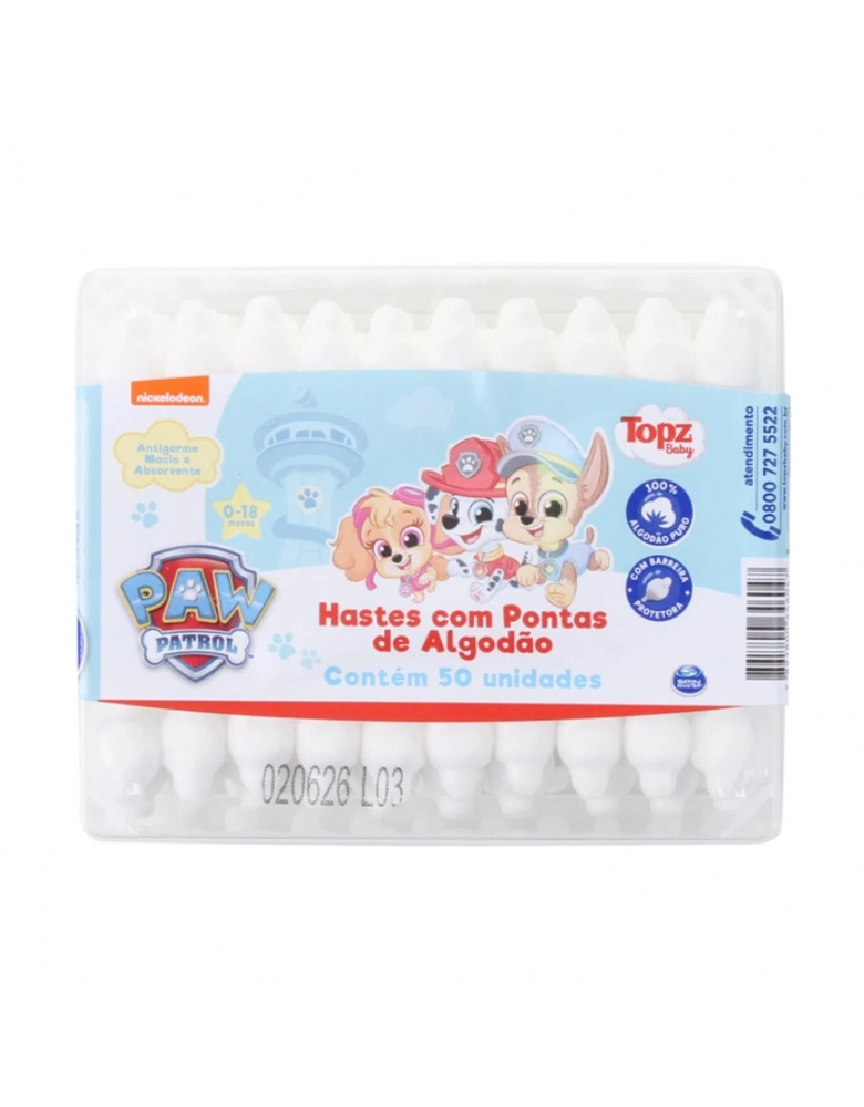 As Hastes Flexíveis Patrulha Canina Topz Baby são produzidas com algodão extra-absorvente, que recebe tratamento bactericida para torná-las livres de impurezas. Suas pontas não se desprendem nem soltam fiapos, proporcionando segurança, maciez e conforto a toda sua família. Use na higiene de áreas delicadas, como orelhas, umbigo, nariz e olhos, e também na aplicação e remoção de medicamentos