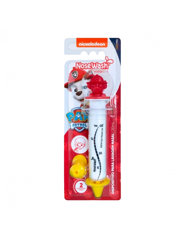 Lavar o nariz de bebês nem sempre é uma tarefa fácil. NoseWash traz uma proposta inovadora ao transformar este momento em experiência mais positiva. Agora com os personagens de Patrulha Canina, os cãezinhos mais famosos do Mundo, e em versão de 20ml, NoseWash oferece um momento mais divertido para as crianças, reduzindo o medo das crianças ao lavar o nariz. Além disso, NoseWash contém adaptadores que protegem o nariz, já que durante a lavagem nasal infantil, os bebes e crianças costumam se mexer bastante e por isso é fundamental esse mecanismo de segurança.