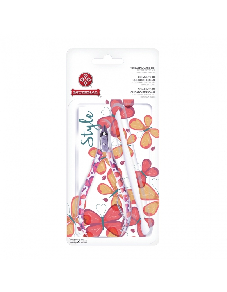 Com uma estampa exclusiva de borboletas coloridas, o conjunto Mundial 758 Borboleta é meigo, resistente e moderno! Disponível na cor branca, o alicate possui cabos plásticos ergonômicos, lâminas e mola em aço inoxidável e espátula dupla plástica! Seu corpo contém proteção antimicrobial* para maior segurança durante o uso, além de já estarem afiados.