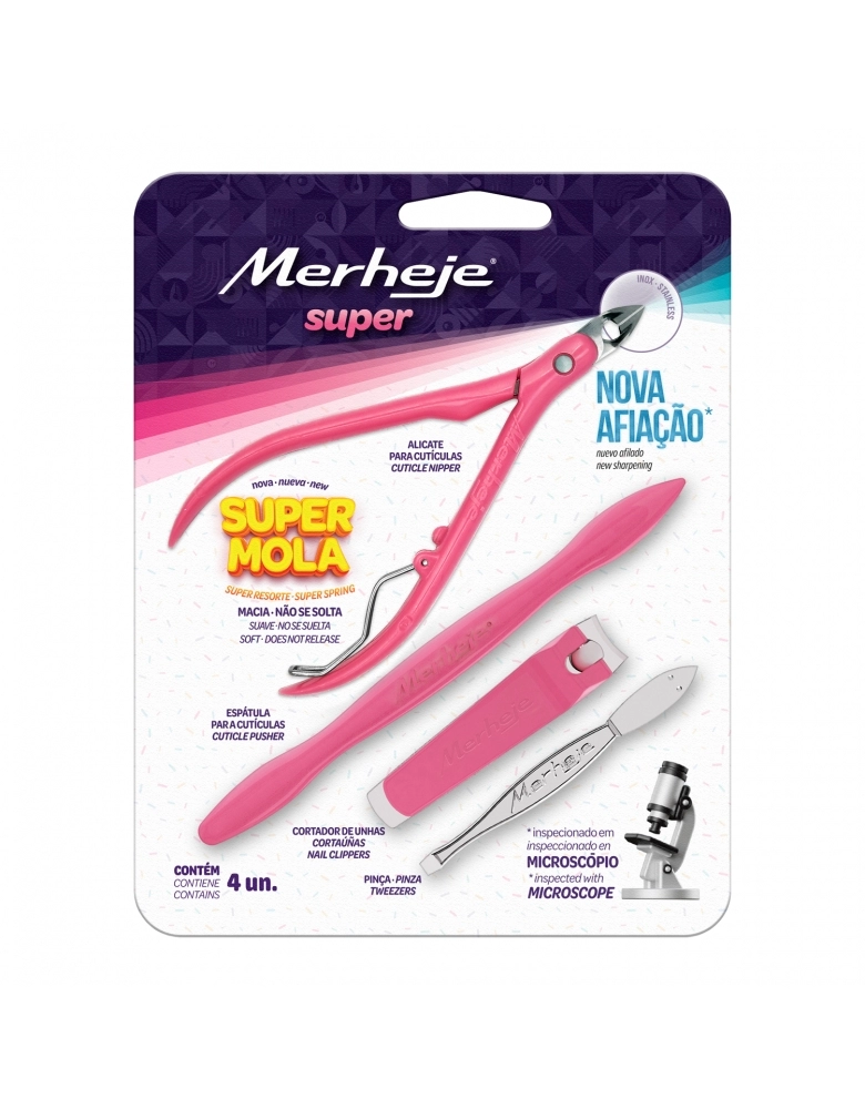 ALICATE CUTÍCULA + CORTADOR DE UNHAS + ESPÁTULA + PINÇA SUPER ROSA MERHEJE