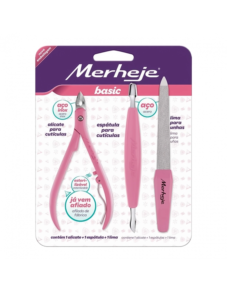 O Kit Merheje Basic é o melhor custo-benefício disponível no mercado, desenvolvido pensando em quem gosta de fazer as unhas em casa. Para isso, oferece material de alta qualidade e precisão. Neste conjunto, você vai encontrar um alicate de cutículas que é feito em aço inox, que já vem afiado e pronto para o uso, e a espátula, que tem dois lados para garantir o melhor acabamento e empurrar as cutículas. É feita de aço carbono e polipropileno. Já a lima para unhas é ideal para dar o acabamento que desejar.