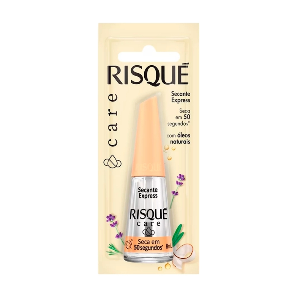 O Secante Express da linha Risqué Care ajuda o esmalte a secar mais rápido. Em 50 segundos, previne contra poeiras, arranhões e borrões superficiais. Sensorial líquido com textura não oleosa. Risqué Care é uma linha de cuidados completa do início ao fim. Conta com diversos produtos em sua linha, todos eles com óleos naturais. Um cronograma de cuidados antes, durante e depois da esmaltação.