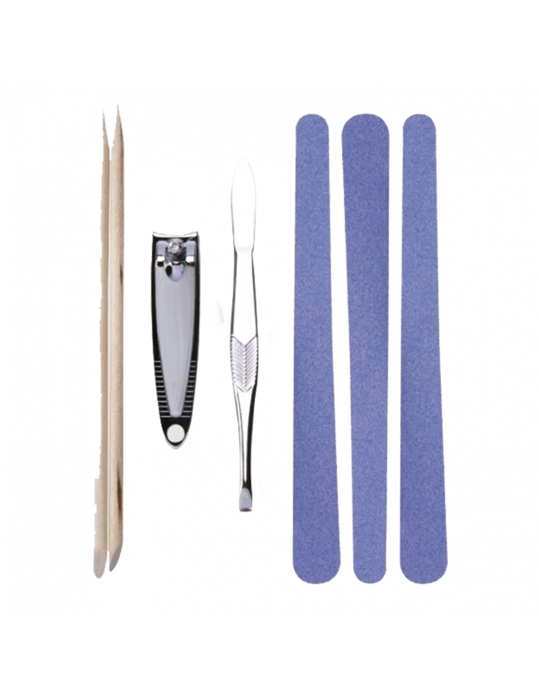 - Contém: 2 palitos, 1 cortador de unhas, 1 pinça e 3 lixas;