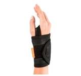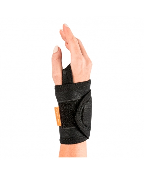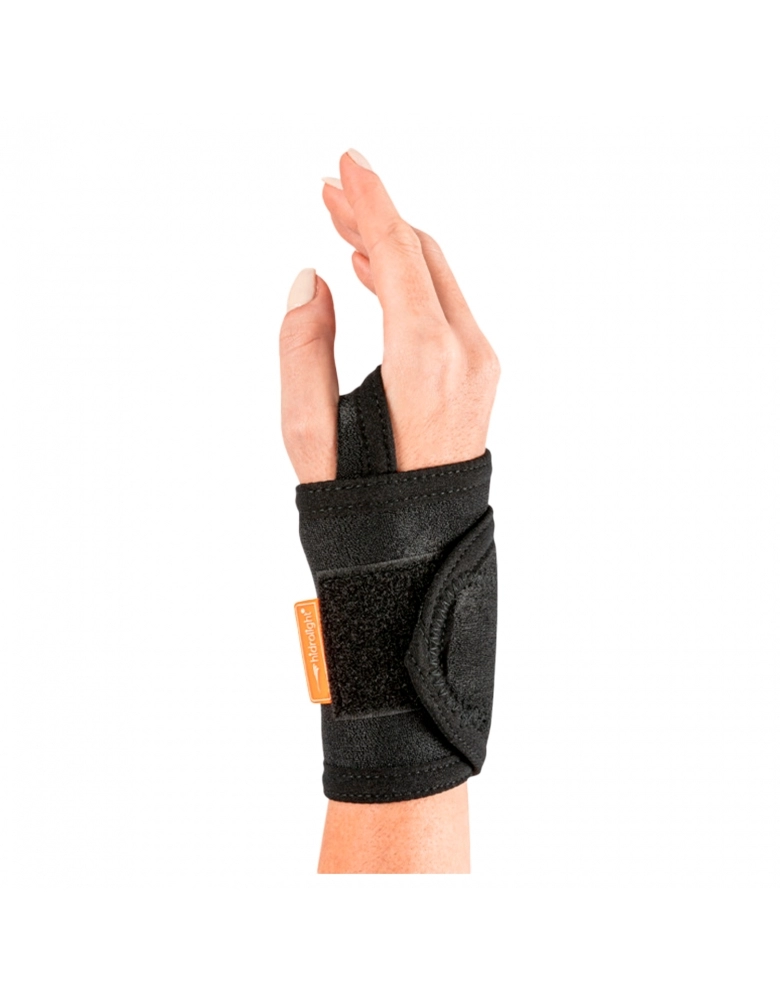 - Insira o polegar no orifício da munhequeira e ajuste a compressão através da aba com fecho aderente em torno do punho.