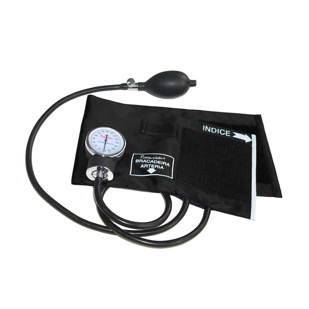 O esfigmomanômetro aneróide Premium (aparelho de pressão) é verificado e aprovado pelo INMETRO, possui manguito e pêra em PVC, braçadeira em nylon e fecho em velcro.