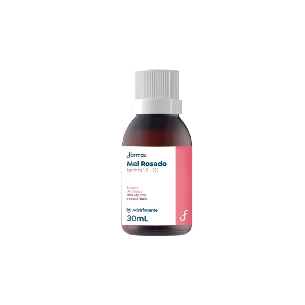 Mel Rosado Farmax 30 mL é uma solução oral de extrato de rosas rubras 10 % — um adstringente indicado para uso em estomatites, especialmente em crianças (como sapinho), e também em adultos com inflamação na boca ou garganta. Sua aplicação pode ser feita pura ou diluída em água, utilizando cotonete, chupeta ou gargarejo conforme orientação.