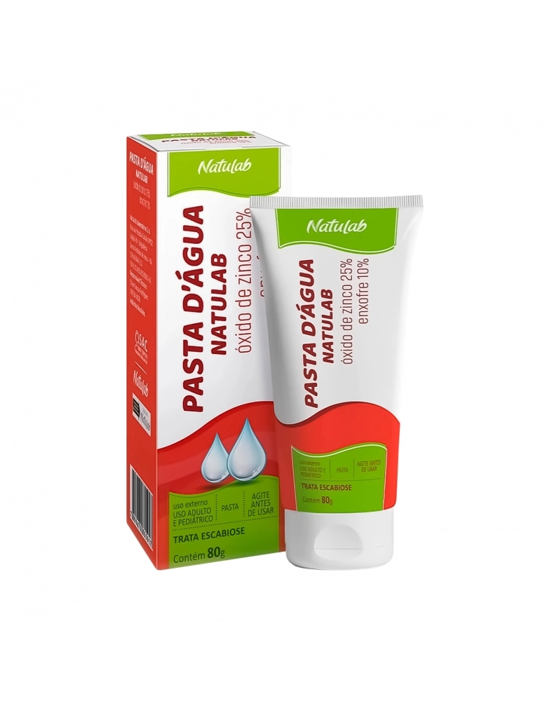 A Pasta D'Água Natulab (Óxido de Zinco 25% + Enxofre 10%) é um produto com ação antisséptica, secativa e cicatrizante, indicado para o tratamento da escabiose, além de auxiliar na recuperação de irritações leves na pele, queimaduras, escoriações e assaduras.